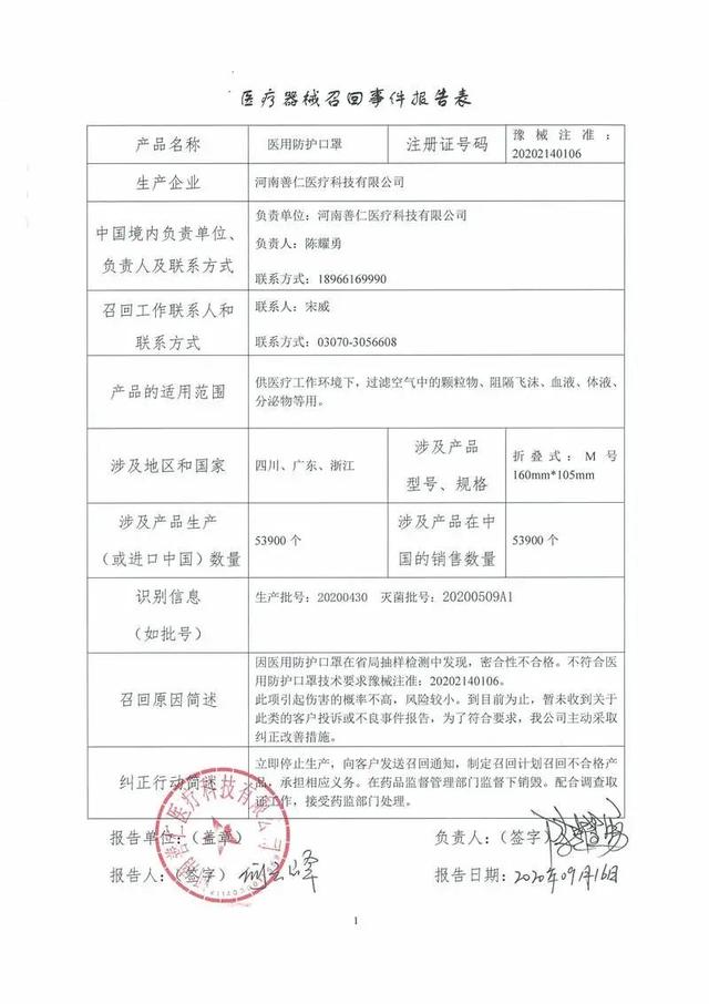 河南善仁医疗科技有限公司报告,由于其生产的一批次医用防护口罩密合性不符合规定,企业对其主动召回,召回级别为三级。召回产品的型号、规格及批次等详细信息见《医疗器械召回事件报告表》。