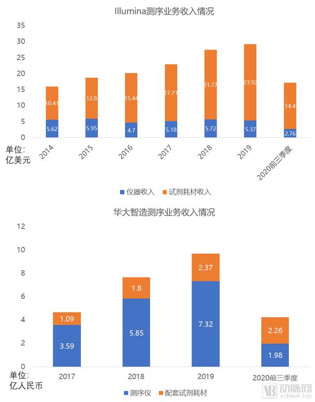 比如2019年Illumina的试剂收入达到23.92亿美元,约是测序仪收入的4.5倍。而华大智造在2019年的测序试剂收入只有2.37亿元,只有测序仪收入的32%。