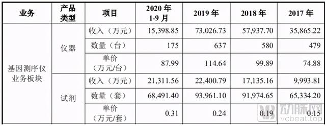测序仪板块仍然在发展的早期阶段,以迅速铺开市场为主。从财报中披露的数据上看,2017-2019年,华大智造的测序仪销售额保持稳步上升,到2019年销售额已经达到了7.32亿元,出货量637台。测序仪平均单价在这三年间也持续上涨,并已经超过了100万元。配套的试剂单价也在连年涨价,2020年1-9月的平均价格已经超过了2017年的两倍。