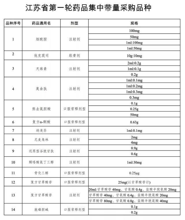 赛柏蓝梳理后发现,此次江苏省共涉及14个品种,共8个品种是注射剂,包括天麻素、奥曲肽、纳美芬、尼麦角林和还原型谷胱干肽等。