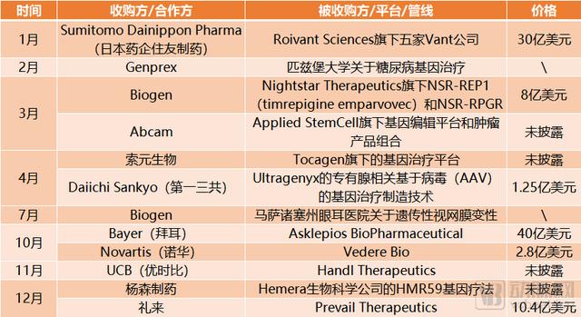 2020年国际基因治疗行业收购/合作最新进展(数据来源:动脉橙数据库)