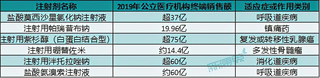 其中,碘克沙醇注射液、多西他赛注射液、盐酸右美托咪定注射液等品类在医院端销售额较高,2019年样本医院销售额约11亿~17亿元,市场潜力大,从类型上来看多为造影剂、止痛剂、肿瘤用药等。