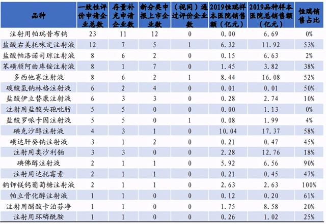 下面就以恒瑞为例,对大型药企的注射剂申报情况作简单分析。根据信达证券的研报显示,截至2020年5月的统计,恒瑞医药共有约20个存量注射剂品种申报一致性评价,大部分样本医院销售规模>1亿元的注射剂品种,均已申报;还有部分按新分类申报上市的注射剂品种,大多目前已上市企业数较少,竞争格局良好;另有3个品种已按新分类获批上市(视同)通过一致性评价。