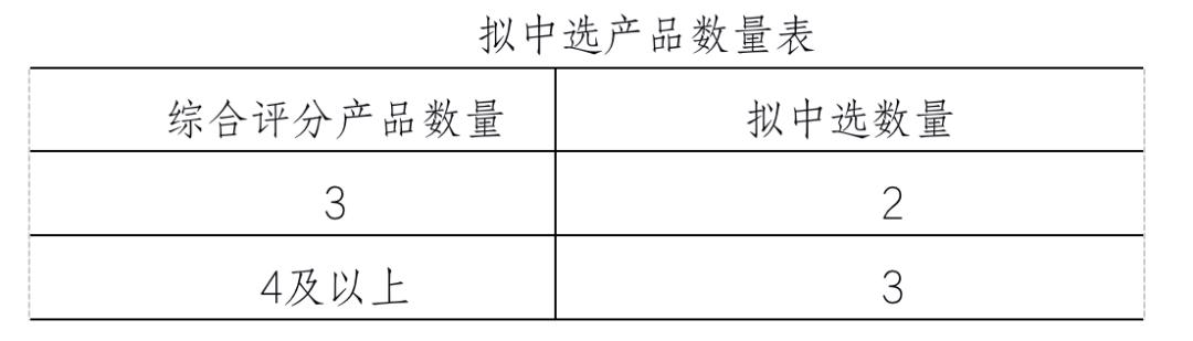 同一目录,申报企业数量大于或等于3家的,将“技术标评分”得分由高到低排序,按照“技术标评分入围数量表”的相应数量,依次确定进入综合评分环节的产品(若最后一名得分相同时,均进入综合评审环节)。