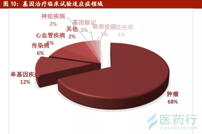 由于基因治疗可以在DNA或mRNA水平上对致病基因进行修正从而达到治疗效果,对特定基因引起的疾病有极大的应用潜能,其中肿瘤和罕见病是基因治疗最主要的应用领域。
