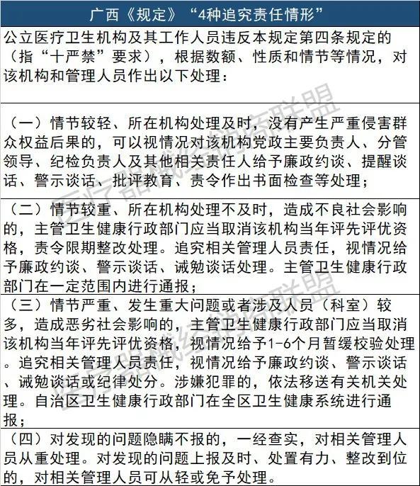 《规定》中显示,广西省将对全区各级各类医疗卫生机构及其工作人员提出廉洁从业“十严禁”要求,处罚收受“红包”、回扣等违规行为6项措施,以及追究公立医疗机构及管理人员责任4种情形,规定将于2021年1月1日起执行。