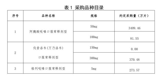 三个品种的约定采购量也相对保守,阿魏酸哌嗪口服常释剂型50mg和100mg分别为3409.46万片和81.55片;伐昔洛韦(万乃洛韦) 口服常释剂型的300mg规格为370.48万片,格列吡嗪口服常释剂型5mg规格为273.57万片。