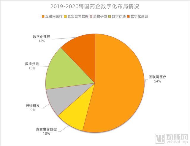 图2则表明,2019-2020年,跨国药企布局在互联网医疗上的动作最多(占比54%),数字化建设布局、数字疗法布局,药物研发数字布局以及真实世界数据研究方面的布局已然相差不大。需要说明的是,与2016-2018年不同,2019-2020年跨国药企的数字化建设主要是用于提升内部运转效率,此时数字化平台搭建相对完善。