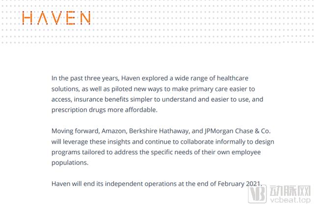三年过去了,现实却没有朝着人们所希望的方向发展。2021年1月5日,据美国媒体《Insurance Journal》透露,Haven将在2021年2月底正式关停。