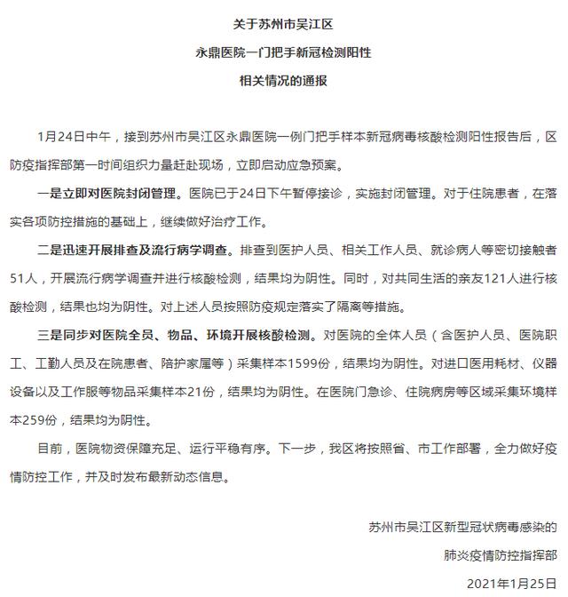 1月24日,苏州永鼎医院发布公告称:该院在对发热门诊开展例行环境监测中,在一门把手上发现一份新冠病毒核酸检测阳性样本,根据防控要求,永鼎医院从即日起停诊。