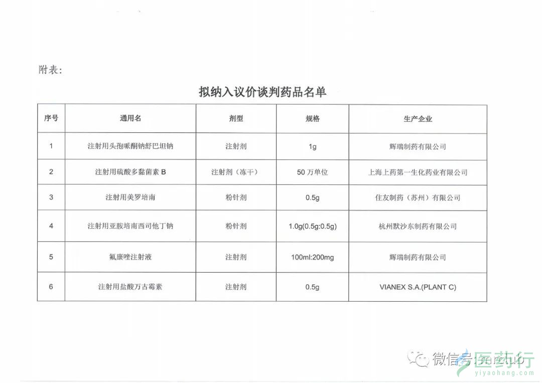 本周,湖南省医保局公布了《关于邀请部分抗菌药物联动目录药品生产企业进行谈判的函》,邀请部分未中标抗菌素外企今日进行议价谈判。 据此函说明,议价谈判的目的是为了进一步优化抗菌药物中标药品结构,更好满足临床用药需求,故结合临床专家意见,对原参与抗菌药物投标未中标后纳入联动目录、且采购金额较多的药品进行议价谈判,从目录来看,辉瑞舒普深、大扶康以及默沙东泰能、礼来稳可信、住友美平等均在列。 湖南省的抗菌素专项集采开始于 2019 年 ,11 月 11 日,湖南省医保局联合 6 部门印发湖南省抗菌素专项实施方案,拟对 52 个抗菌素进行专项集中采购。 直至去年 4 月 15 日,湖南省公布了抗菌药物专项集中采购的中标结果 ,自 5 月 1 日起正式网上采购,本次中选结果除拜耳医药的莫西沙星外,其他均为国内药企产品。 去年 12 月 1 日,湖南省联合重庆市、贵州省、云南省、广西壮族自治区进行的第一批常用药品联合带量采购中选结果公布,其中多个中选抗生素产品均为国内药企生产,包括哌拉西林他唑巴坦、头孢他啶、头孢噻肟、替加环素等。 一个月前,湖南省公共资源交易中心曾发文,暂停了部分抗菌药物基层采购资格,原因是采购价格较高,采购金额异常上涨,包括大熊制药的头孢地嗪、白云山天心制药的头孢哌酮舒巴坦、上海上药新亚药业的头孢替安等针剂。 另外,并不是价格较高的抗菌素被暂停,湖南省还对抗菌素专项集采目录内中标药品的执行采购冲击较大的联动药品,暂停其联动挂网资格,包括瑞阳制药的注射用美洛西林钠、华药华民药业的头孢孟多酯钠、沈阳第一制药的注射用乳糖酸阿奇霉素等,对于联动挂网的药品,湖南省一般要求低于其他省级挂网价格(广东、福建和重庆除外)。