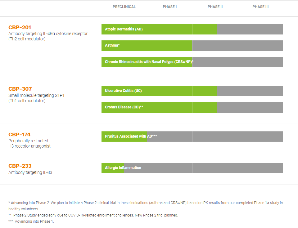除具有Best-in-Class潜力的两款创新药——治疗中重度特应性皮炎的CBP-201和治疗溃疡性结肠炎的CBP-307之外,康乃德也在同步推进三个用于治疗多种严重的炎症性疾病的创新药的临床前项目,其中包括两个小分子候选药物(CBP-174和CBP-312)和一种靶向IL-33的抗体(CBP-233)。康乃德拥有其新药管线中所有产品的全球权利。