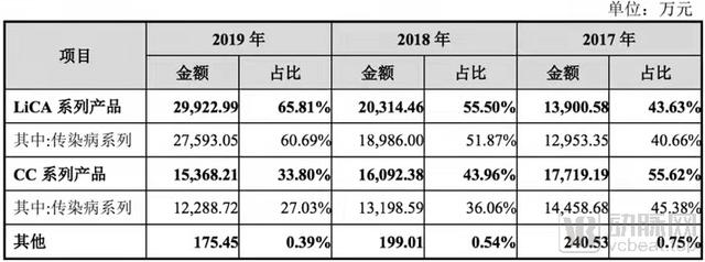 近年来,科美诊断正在将业务战略重点从酶促化学发光转移至基于光激化学发光的LiCA系列产品。招股书显示,科美诊断已经停止基于酶促化学发光的CC系列产品相关的研发投入和销售渠道建设。CC系列产品营收占比正在下滑,2017年-2019年及2020年上半年各期末,公司CC系列产品营业收入占公司营业收入的比重分别55.62%、43.96%、33.80%和20.39%,占比逐期减少。