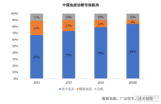 免疫诊断具有灵敏度高、成本低的特点,是近年来发展较为迅速、市场规模最大的体外诊断细分领域。自2010年到2018年,国内体外诊断市场中生化诊断的市场份额由27%降低至19%,免疫诊断的市场份额由27%增加至36%,远超其他细分领域。