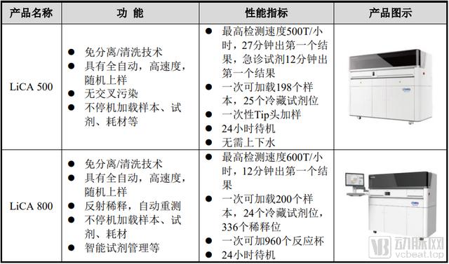 科美诊断在国内率先建立了具有自主知识产权的光激化学发光技术平台。基于光激化学发光技术平台,科美诊断研发出LiCA系列产品。LiCA系列仪器具备操作流程简便、检测通量高等特点,其中LiCA 500和LiCA 800仪器单机最高检测速度分别达到500T/h、600T/h。公司即将上市的LiCA Smart能够更好满足急诊、中小型医院的临床诊断需求,正在开发的LiCA 4000仪器具有随机检测功能并支持联机,能够更好满足检测种类多、检测量较大的终端需求。