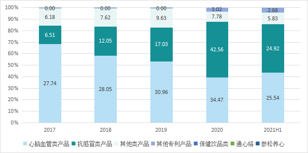 图2:2017-2021H1以岭药业不同类型产品营业收入