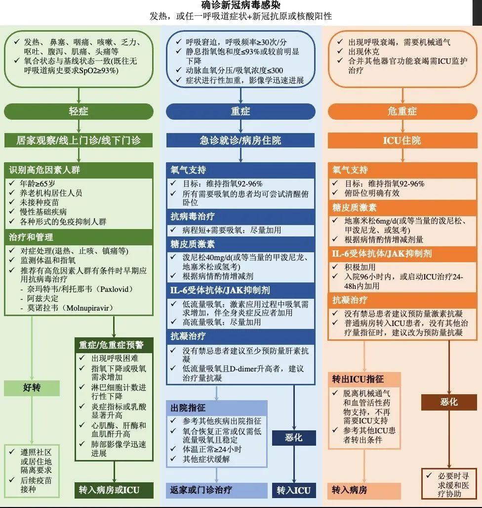 新冠病毒感染带来的挑战仍将持续相当长时间,因严重程度不同,感染者群体可能在门诊、病房、ICU等不同区域接受诊治,本诊疗建议综合目前最新临床证据,将不同场景下的诊治建议进行了梳理与整合(图3),有助于实现从门诊到出院的全流程管理,希望为当前“保健康、防重症”这一新冠诊疗核心任务提供决策支持。相信本诊疗建议可以提升广大医务人员对新冠病毒感染及其危重症的认识,提高患者救治水平。