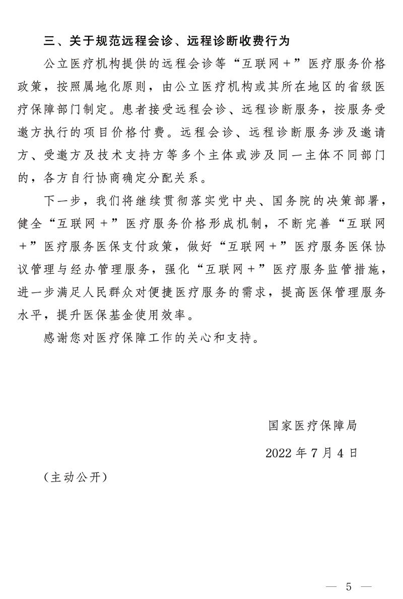 日前,针对王静成代表提出的将互联网远程会诊远程诊断费用纳入医保结算体系的建议,国家医保局明确,公立医疗机构提供的远程会诊服务价格政策,按照属地化原则,由公立医疗机构或其所在地区的省级医保部门制定。“互联网+”医疗服务如果与医保支付范围内的线下医疗服务内容相同,且执行相应公立医疗机构收费价格,可纳入医保支付。
