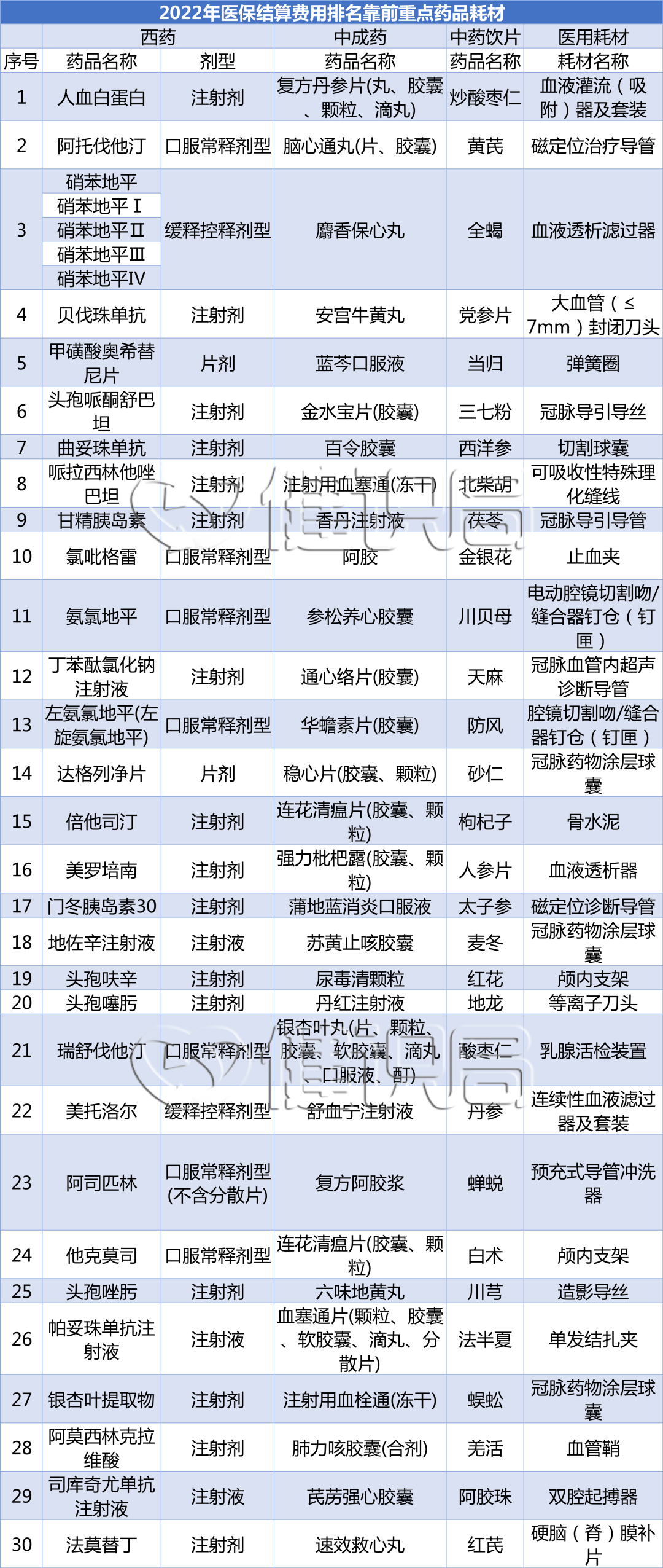 这份通知的核心部分,就是罗列出了西药、中成药、中药饮片和高值耗材四大领域各30个、共计120个医保费用排名靠前的产品,要求重点监控。