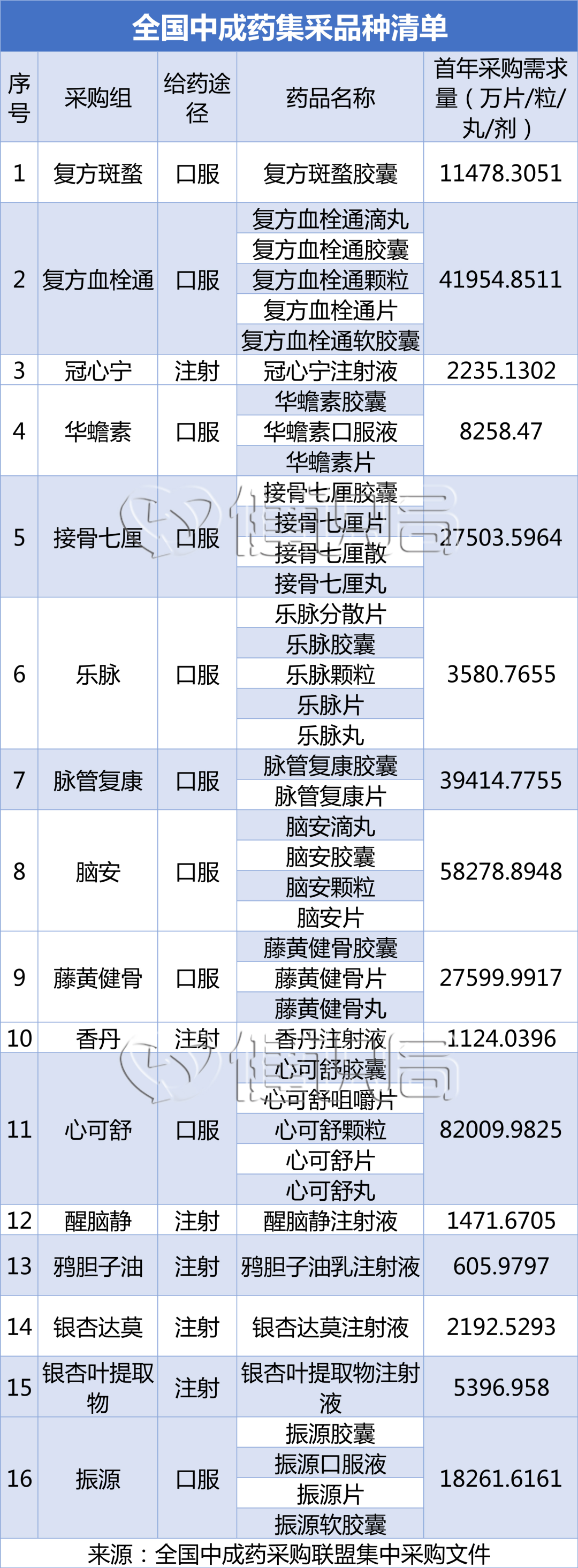 集采品种里,复方斑蝥、复方血栓通、接骨七厘、脉管复康、脑安、藤黄健骨、心可舒、振源8种药品的首年采购需求量高达上亿份。