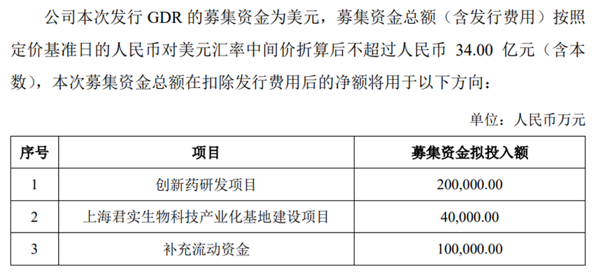 6月7日,君实生物发布公告称,公司将寻求境外发行GDR ,拟募资金额不超过人民币34亿元,此次募资将主要用于创新药研发项目、上海产业化基地建设项目和补充流动资金三项。