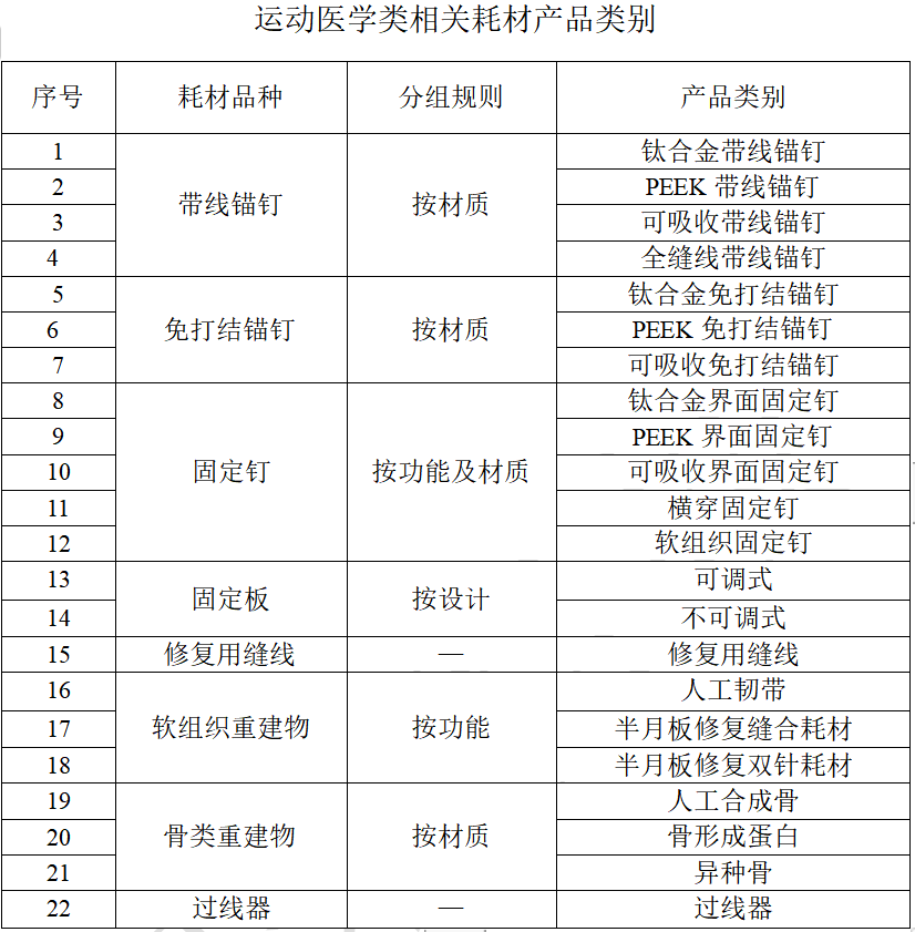 目前运动医学领域中,仅带线锚钉在河南、北京、江苏进行过小范围集采。这次国采一下子纳入了22个类别耗材,出乎市场意料。