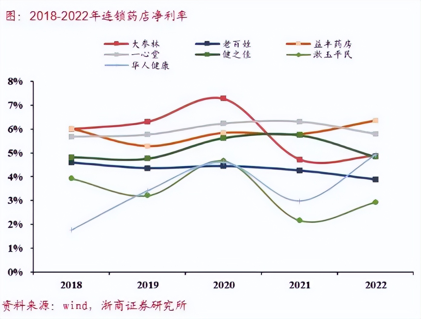 据浙商证券,2018年-2022年之间,国内头部连锁药店的净利率在2%-8%之间。