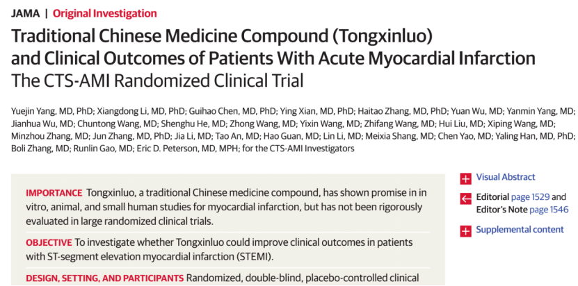 [1] Yuejin Yang, Xiangdong Li, Guihao Chen, Ying Xian, et al. Effect of A Traditional Chinese Medicine Compound (Tongxinluo) on Clinical Outcomes of Patients with Acute Myocardial Infarction The CTS-AMI Randomized Clinical Trial. JAMA, 2023, 330(16): 1534-1545.