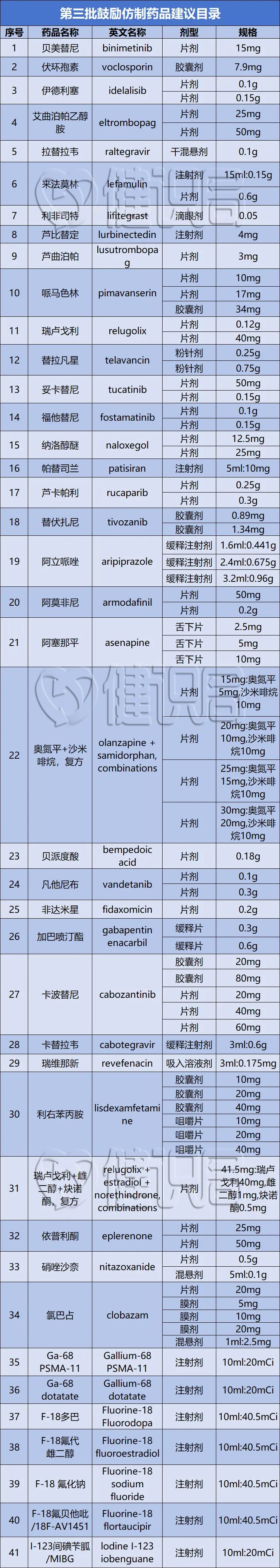 就在前一天,国家卫健委也公示了涉及41款品种第三批鼓励仿制药建议目录,与前两批次目录相比,第三批目录品种有所增加,并且覆盖范围更加多元。