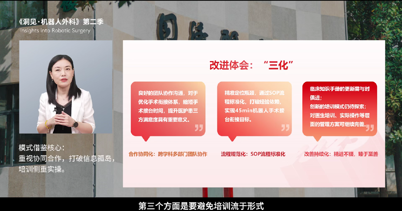 谈及未来的完善方向,陈红表示,该院将持续优化临床知识手册,针对18个亚专科完善机器人手术护理路径,实现全流程、全域化的标准化;创新培训模式,深化原位模拟培训,提升护理人员实操能力;对医生手术资质实施动态管理,结合手术效果和操作规范持续优化授权标准。