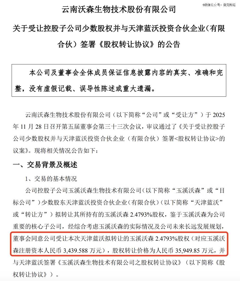 沃森生物同时公告,公司控股子公司玉溪沃森生物技术有限公司少数股东天津蓝沃投资合伙企业拟转让其所持有的玉溪沃森2.4793%股权,董事会同意公司受让本次天津蓝沃拟转让的玉溪沃森2.4793%股权,股权转让价格为人民币3.59亿元,并与天津蓝沃签署《玉溪沃森生物技术有限公司之股权转让协议》。