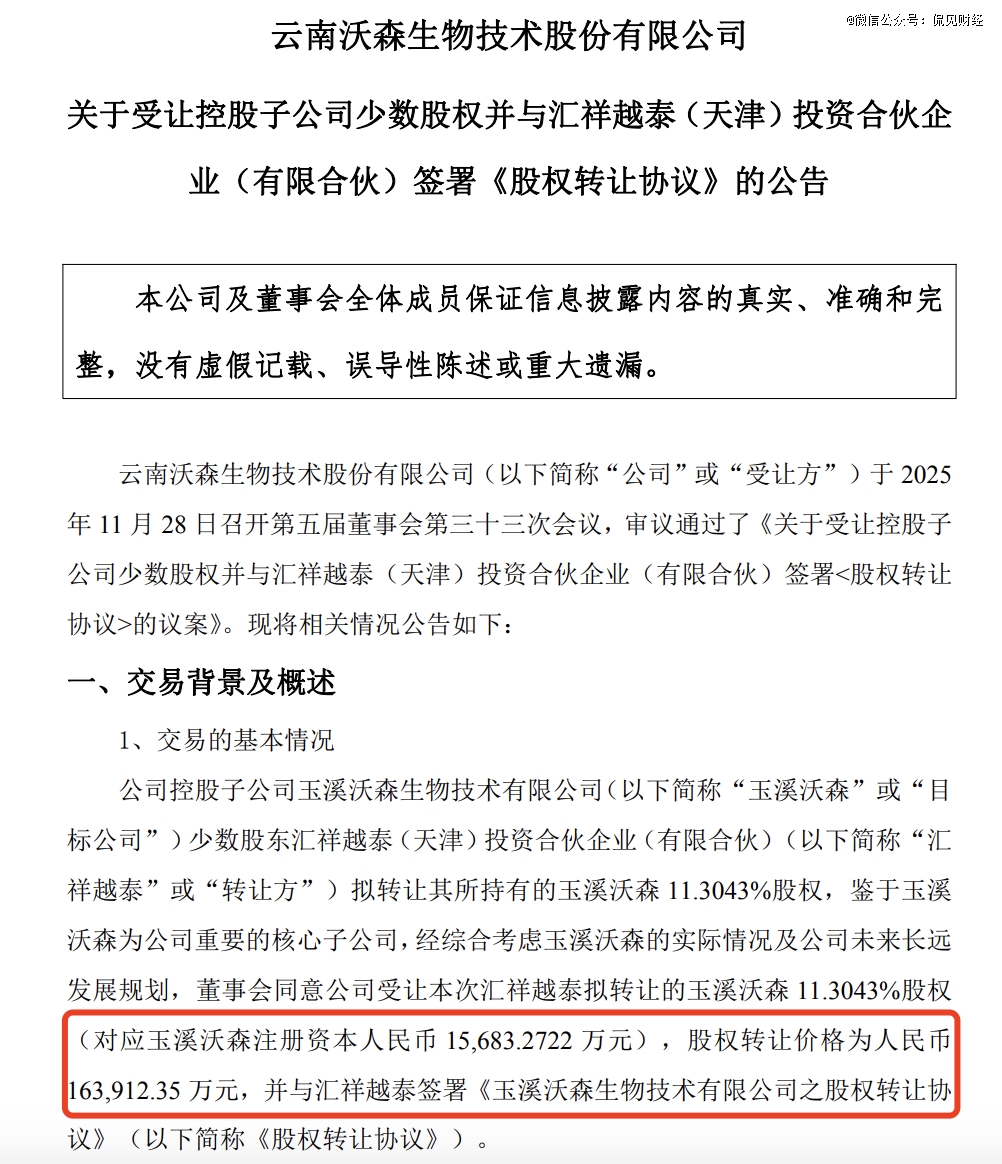 11月28日晚间,沃森生物公告,玉溪沃森少数股东汇祥越泰投资合伙企业拟转让其所持有的玉溪沃森 11.3043%股权,鉴于玉溪沃森为公司重要的核心子公司,经综合考虑玉溪沃森的实际情况及公司未来长远发展规划,董事会同意公司受让本次汇祥越泰拟转让的玉溪沃森 11.3043%股权,股权转让价格为人民币16.39亿元,并与汇祥越泰签署《玉溪沃森生物技术有限公司之股权转让协议》。