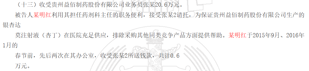 记者检索中国裁判文书网发现,此摘录文章源自《某明红受贿一审刑事判决书》。此判决书显示,贵州益佰制药股份有限公司业务员涉其中。