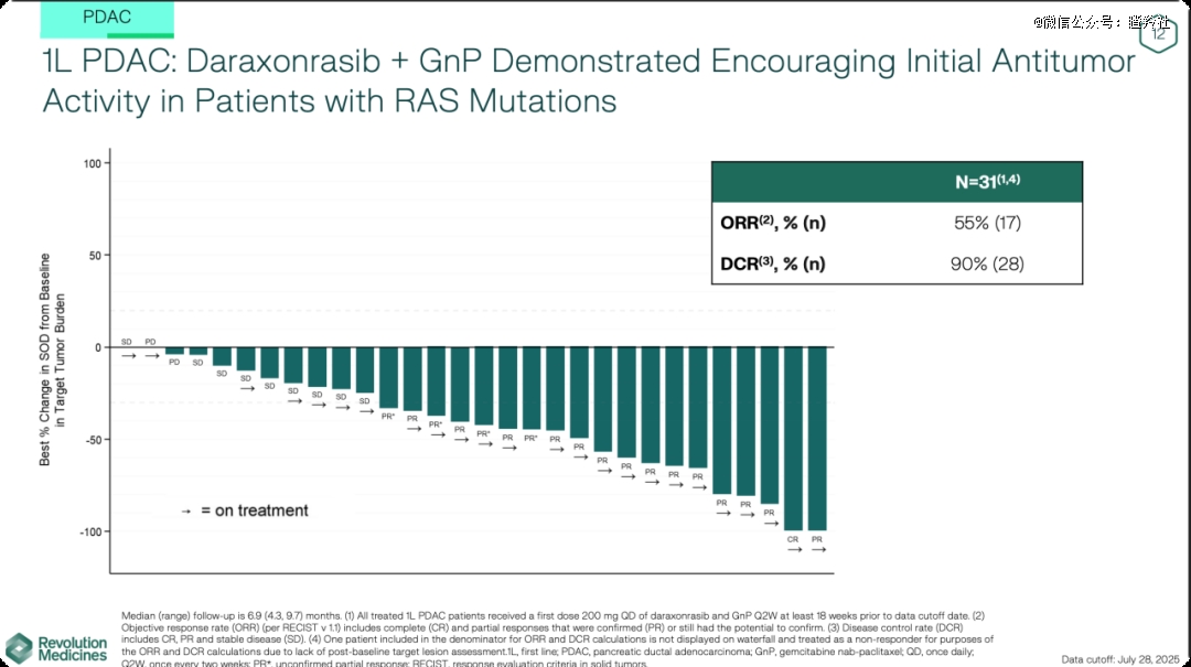 GFH375在胰腺癌中展现了自身惊艳的疗效。注意,这可不是一线治疗胰腺癌的数据,其中70%的患者接受了三线及以上的治疗,且1/3的患者接受过PD-1/PD-L1等免疫治疗。最后我们也看见了DCR达到了97%,仅有两人出现疾病进展,而ORR达到了41%,这对于后线治疗胰腺癌的数据来说无疑是相当振奋人心的。
