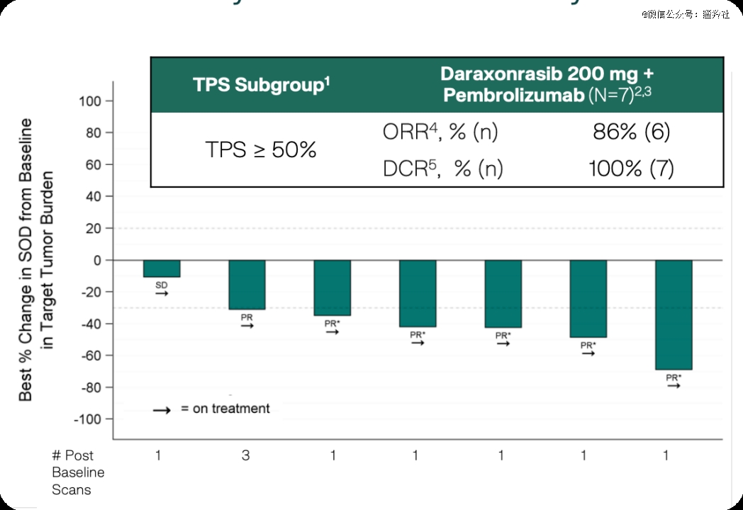 除此之外,RMG-6236还尝试与帕博利珠单抗与化疗联用用于一线治疗,如下图所示,在TPS≥50%的PD-L1阳性患者中,该联合疗法的ORR达到了86%,7名患者中有6名缓解。