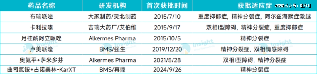 而根据insight数据库统计,2015-2025年,全球仅有6款精神类药物上市,典型的是大冢制药研发的座位阿立哌唑的接班药物布瑞哌唑,但它没有再现阿立哌唑的销售神话,其销售额在2022年超过20亿美元,之后由于仿制药冲击销售额开始下滑。