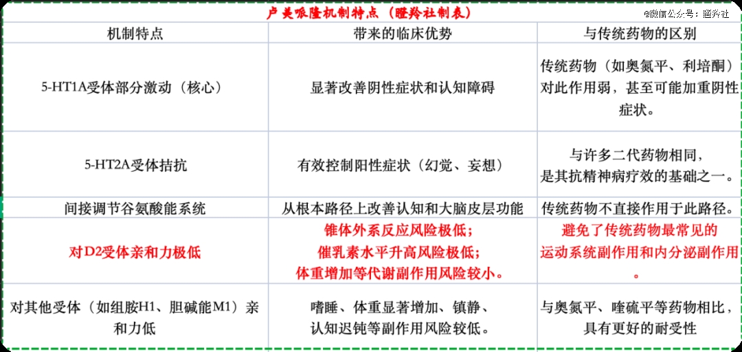 除此之外,最近十年之内获批的重磅精神类药物,不得不提卢美哌隆,卢美哌隆代表了精神分裂症从“多巴胺中心论”向“血清素-谷氨酸轴调节”转变的创新治疗策略。它通过独特的5-HT1A部分激动与5-HT2A拮抗的协同作用,在有效控制阳性症状的同时,特别针对了精神分裂症最致残且治疗手段匮乏的阴性症状和认知缺陷,下图为其机制的总结。虽然它2023年的销售额才4.67亿美元,但是GlobalData的分析师预测,到2031年(强生公司收入模型中最远的年份),它的年销售额将达到27亿美元。