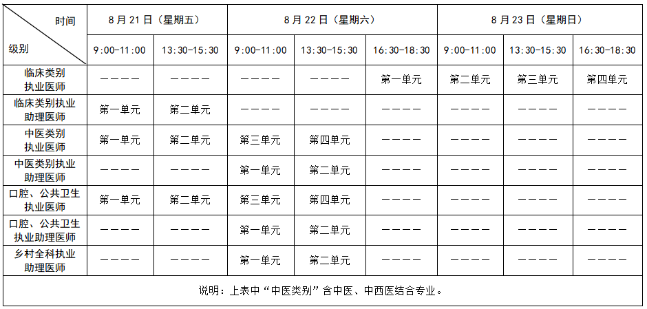 考试实行计算机化考试,军队现役人员、文职人员加试军事医学,院前急救岗位和儿科专业加试相应内容。执业医师合格分数线为360分,执业助理医师合格分数线为180分。考试时间如下: