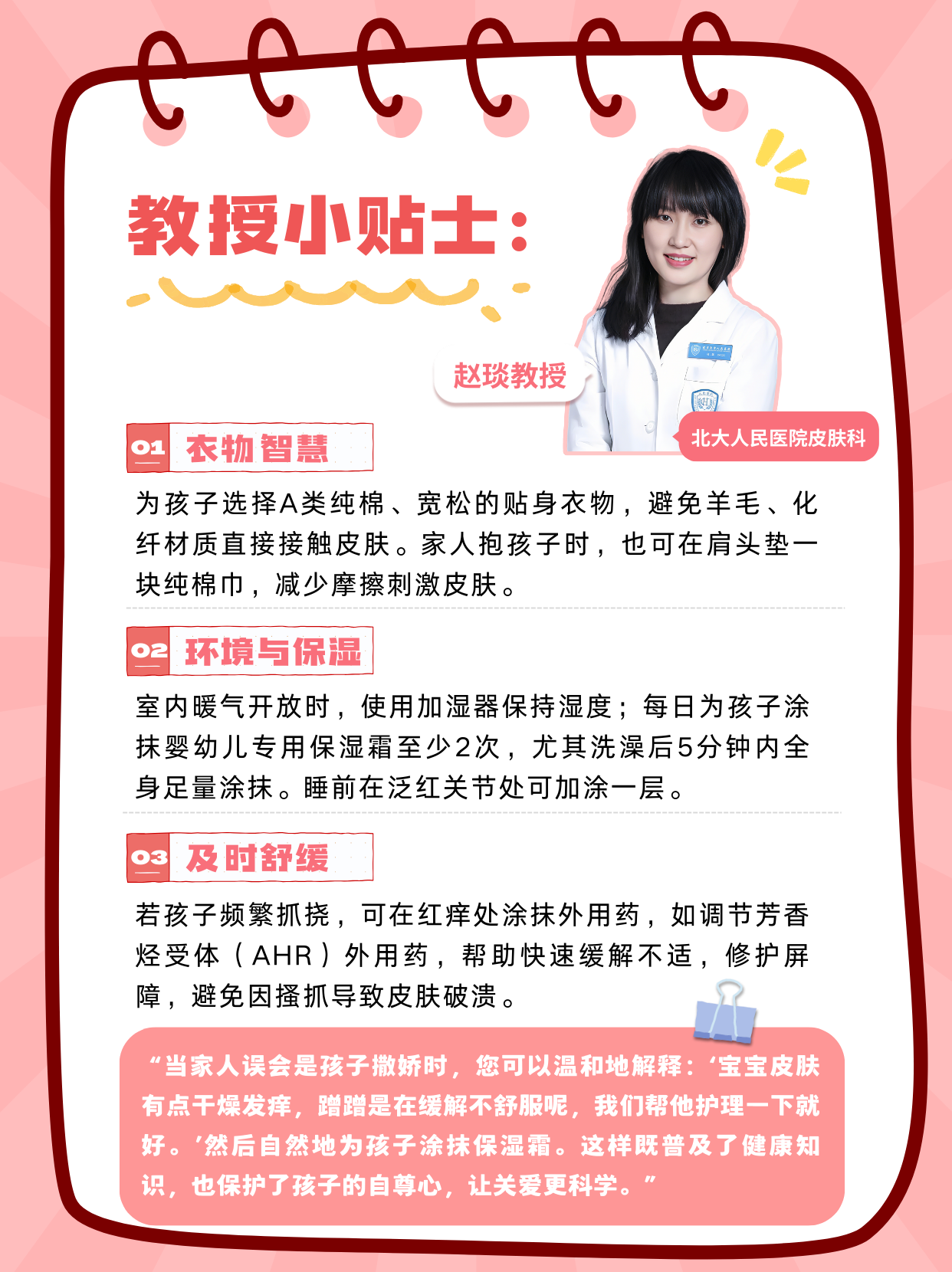 2.环境与保湿:室内暖气开放时,使用加湿器保持湿度;每日为孩子涂抹婴幼儿专用保湿霜至少2次,尤其洗澡后5分钟内全身足量涂抹。睡前在泛红关节处可加涂一层。