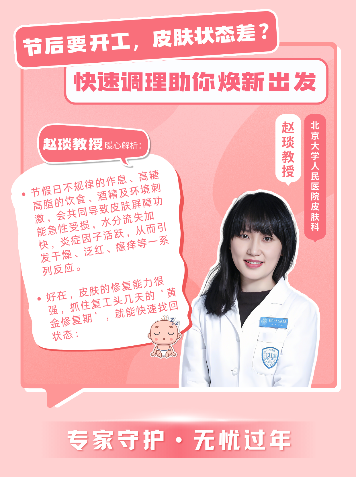 “节假日不规律的作息、高糖高脂的饮食、酒精及环境刺激,会共同导致皮肤屏障功能急性受损,水分流失加快,炎症因子活跃,从而引发干燥、泛红、瘙痒等一系列反应。好在,皮肤的修复能力很强,抓住复工头几天的‘黄金修复期’,就能快速找回状态:”