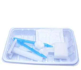 1)产品可由备皮刀、一次性使用PE手套、纱布块、棉球、镊子、包巾、托盘、滑石粉组成。