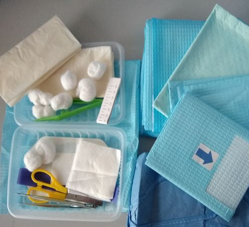 盘1个、蓝色隔离衣(无纺布覆膜)1张、大中单1张、小中单1张、包纸1张、洞巾1张、干棉球6个、塑料镊子1把、床垫I张、止血带1条、乳胶手套1付、纸尺1张、托盘1个。