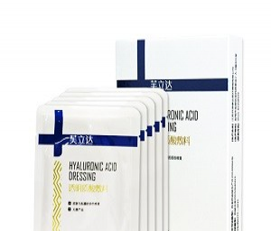 透明质酸敷料由透明质酸原液、无纺布组成,以铝箔袋封装。透明质酸原液由透明质酸钠0.2%、山梨酸0.1%、苯甲酸钠0.15%、纯化水99.55%组成。敷料经Co60灭菌或湿热灭菌后应无菌。