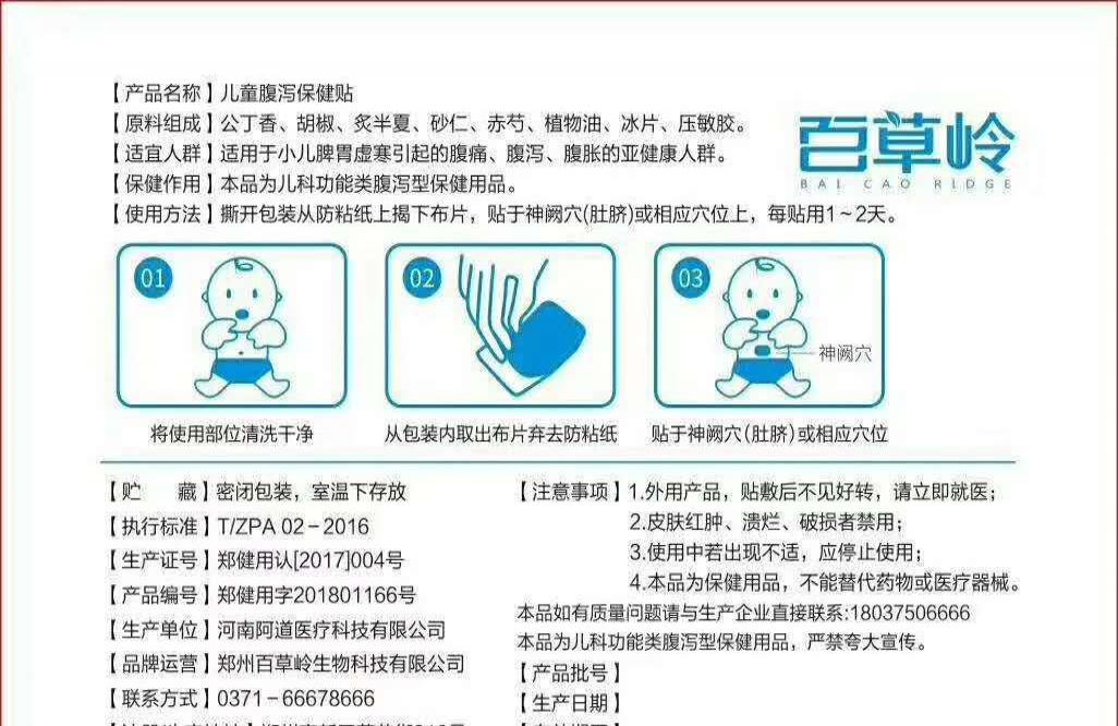 郑州百草岭生物科技有限公司小儿透皮贴以野生中药材和自然植物提取液为新基质,利用现代超微技术和新型冷冻干燥技术为载体,历经150年品牌传承与发展,结合临床实践经验精制而成,解决了传统外用贴剂吸收利用低的核心问题,减少了药物的全身效应和不良反应,提高了患者病变部位的血药浓度,比口服用药利用率高达70%左右,达到了具有确切疗效的祛病除疾效果,成为继口服用药、注射制剂之后的第三代新型药物制剂。