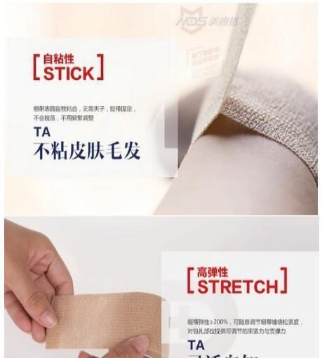 •自粘性:自身粘合,不粘毛发、皮肤、衣物,遇汗水不脱落