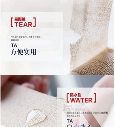 •自粘性:自身粘合,不粘毛发、皮肤、衣物,遇汗水不脱落
