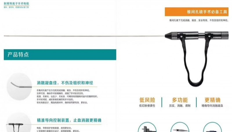 应用:髓核减压、椎间盘切除和髓核摘除术。型号:VAM-Z-3040340维奥等离子手术刀头VAM-3040340椎间孔镜手术射频电极维奥等离子手术刀头VAM-3040340椎间孔镜手术射频电极特征:1:VA8182等离子刀是一种标准的刀片,在椎间孔内窥镜下,做髓核减压,切除和椎间盘切除术,同时可完成完全消融,止血并没有伤到组织和神经。2:采用新的涂层技术,在手术过程中无粘连、无碳化、视野清晰、导电性好。3:如果使用钳夹机除去,由于夹钳是直柄型,头部较大,所以不易到达椎间隙。如果使用等离子刀,直径小于2.0mm,它比夹越小,还可调节伸缩手柄,很容易把叶片粘连和钙化区,可以汽化,切割,消融和分离组织实时,更进一步,它是清理的物质椎间孔与盘之间很容易。4:VA8182等离子刀可与我国或进口主机匹配,为用户提供更多的选择。5:叶片的设计特点:维奥等离子手术刀头VAM-3040340椎间孔镜手术射频电极椎间空镜手术有那些优缺点,这也是一个比较复杂的问题,甚至脊柱外科医生们都在争论,但是我还是选择一些的理念,让大家参考:椎间孔镜微创手术的优点:(1)手术创伤小:与常规开放手术相比,脊柱微创手术切口小,只有6毫米,对椎旁肌肉是撑开的,几乎没有损伤的对骨关节损伤也明显减小。(2)疗效满意:对于合适的患者,疗效高于开放手术,近期预后优秀率超过85%(也就是说还有约15%的患者手术后不能缓解疼痛等症状)。(3)恢复快,手术后就可以活动。(4)出血少,手术出血非常少,可以说忽略不计。(5)皮肤切口小,美观。(6)住院时间短,当天出院,住院仅几小时。(7)疾病复发和再发时更容易补救,甚至可以补救开放手术的问题。关于手术的过程,我们采用的微创方法叫做椎间孔镜,像导弹似的,透视下,非常的,将一根直径6毫米粗细的管道,引导直达到椎间盘病变的位置,解除突出组织对神经的压迫。大约就是这个过程。局麻手术。需要住院1~3天,大部分患者当日回家。术中病人是清醒的,随时可以和医生沟通交谈。再说说缺点:(1)微创手术的风险与标准开放手术相当,微创但并不是危险也小了。(2)不能完全摘除椎间盘,存在复发可能。(3)手术仍然是破坏性的,不能完全恢复记住平衡。(4)微创的侧重点在于解决症状,远期复发率比开放手术高。(5)适应症窄,不是所有患者都适合微创手术,尤其是脊柱畸形、神经走形变异、以及第五腰椎间盘不适合腔镜手术,不可以勉强手术治疗腰椎间盘突出椎间孔镜微创手术,作为外科阶梯治疗的方法,有非常明显的优势和广阔的应用前景。要理解这种技术是用缓解症状的方式来赢得时间,尽量拖延腰椎融合手术的方法。要理解这种方法虽然好,但是不能扭转腰椎退变生理过程,只能暂时解除疼痛。这种技术只能适用于某些情况,要把握好适应症,不能所有腰椎疾病都用这种方法治疗。所以奉劝患者朋友不要因为担心常规手术的风险而坚定地选择ldquo;微创手术rdquo;。提醒大家,有些病情是不建议应用微创方法的,即微创一般解决局部微小的问题,不能治疗腰痛、椎管狭窄和滑脱。这种时候,我们就应该找到一种能够解决患者问题的方法。而不是一味地炒作微创的概念。医患双方不要过分迷信微创的口号,实事求是地来选择,使得患者获得好的结果。