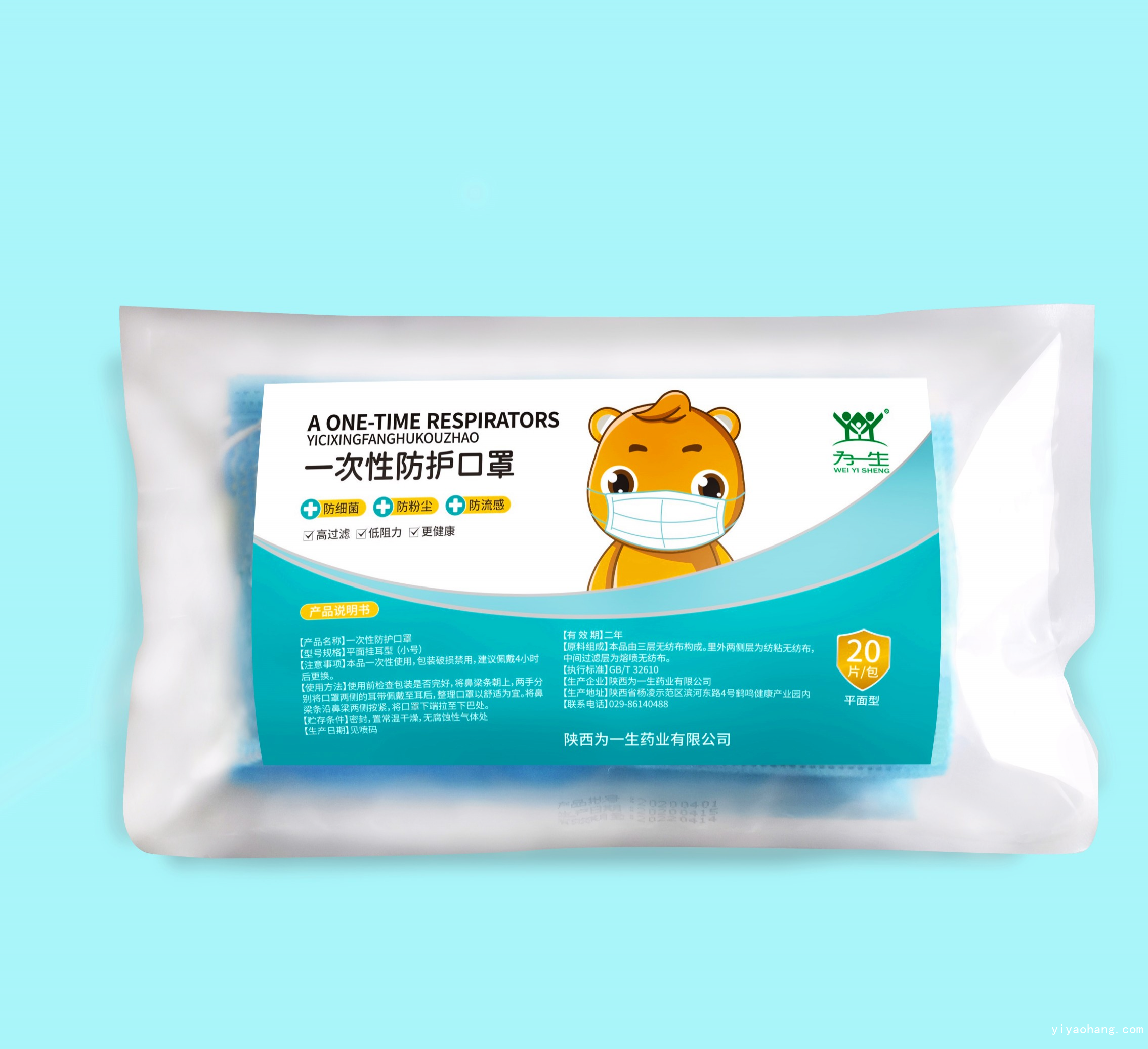 使用方法:使用前检查包装是否完好,将鼻梁条朝上,两手分别将口罩两侧的耳带佩戴至耳后,整理口罩以舒适为宜。将鼻梁条沿鼻梁两侧按紧,将口罩下端拉至下巴处。
